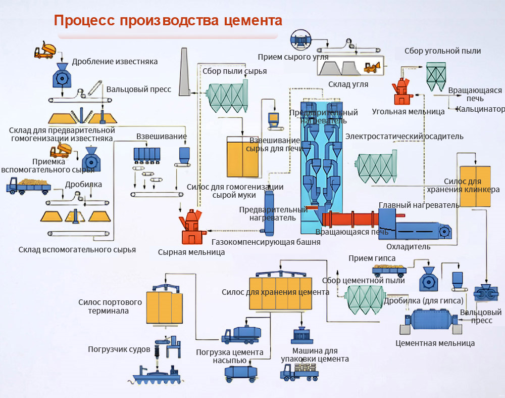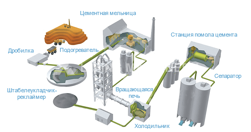 Измельчение сырья осуществляется с помощью вертикальной мельницы, в которой часть низкотемпературных отработанных газов, выходящих из задней части печи, используется в качестве источника тепла для сушки. Материал измельчается и сушится внутри мельницы. Комочки, выпадающие из воздушного кольца вертикальной мельницы, возвращаются в мельницу с помощью ленточного конвейера и ковшового элеватора для дальнейшего измельчения. Полученный порошок сырья собирается в циклонном сепараторе с помощью воздушного потока из мельницы, а затем по воздуховоду и ковшевому элеватору поступает в силос для гомогенизации сырья. Остаточные газы, выходящие из задней части печи, увлажняются и охлаждаются в увлажнительной башне, а затем поступают в электростатический осадитель вместе с отработанными газами мельницы. После очистки электростатическим осадителем они выбрасываются в атмосферу.