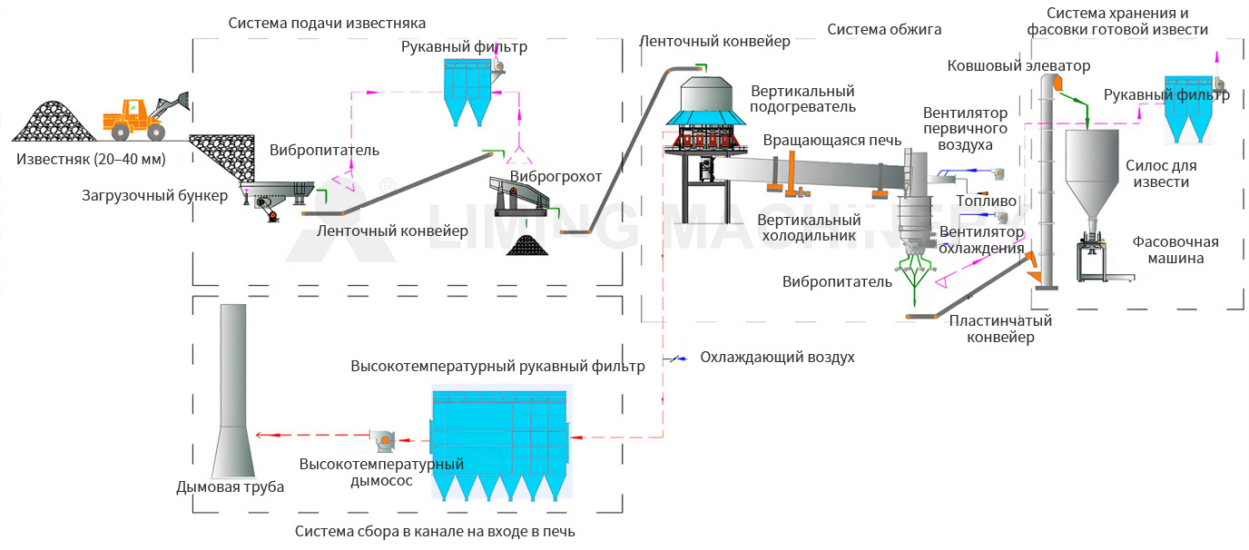 Вертикальный подогреватель, вращающаяся печь и вертикальная система охлаждения (150–1200 т/сут) обрабатывают известняк. Материал предварительно нагревается до температуры выше 1000 °C дымовыми газами печи, частично разлагается, а затем подается в печь для прокаливания. После охлаждения воздухом до температуры ниже +60 °C нагретый воздух возвращается в печь в качестве вторичного воздуха для горения.