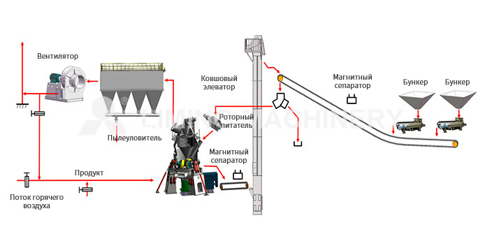 Мельница работает по принципу измельчения на слое материала: вращающийся измельчающий диск формирует стабильный слой материала, а гидравлические ролики оказывают высокое давление, измельчая материал путем сжатия и сдвига. Одновременно с этим горячий воздух поступает из нижнего воздуховода, поднимая и суша мелкие частицы (влажность ≤8%). Встроенный вихревой классификатор регулирует степень измельчения с помощью угла наклона лопастей (обычно ≤10% остатка на сите 45 мкм), объединяя измельчение, классификацию и сушку в одном устройстве без использования внешнего сушильного оборудования.